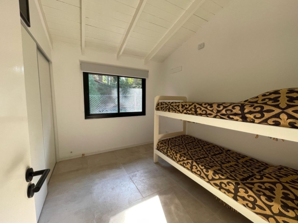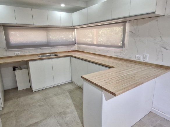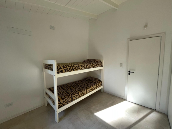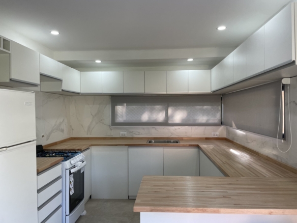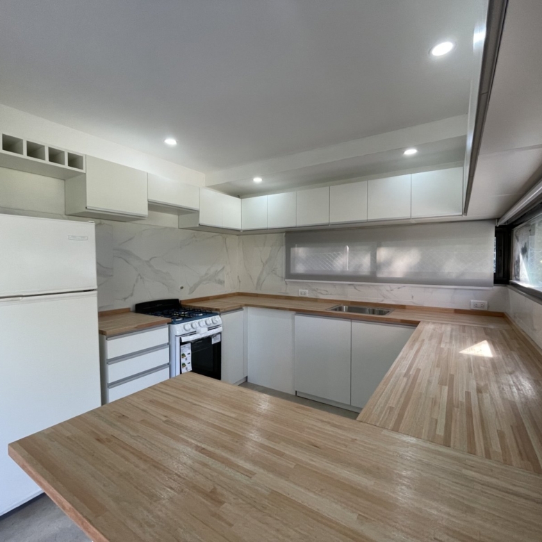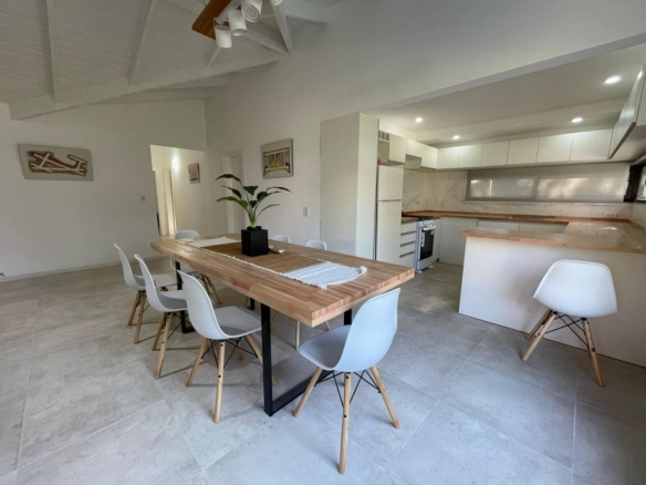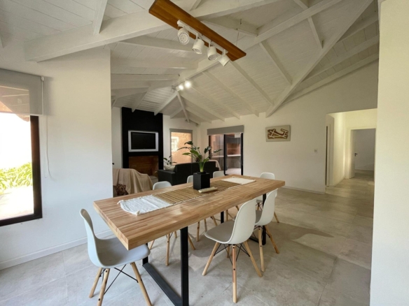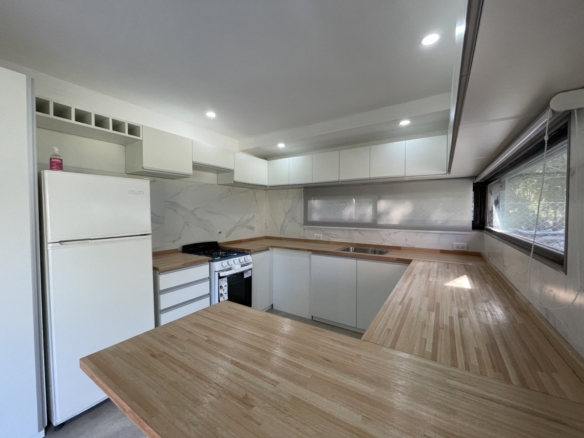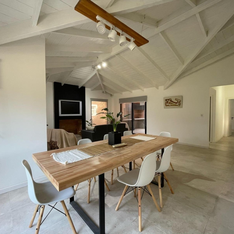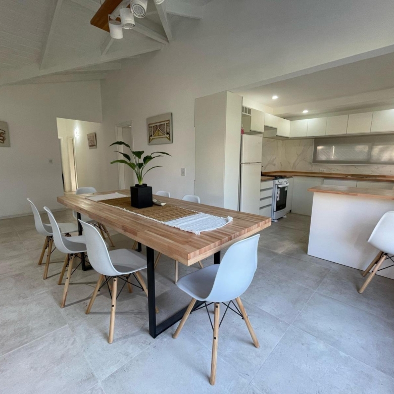Esta espectacular casa, luminosa y con amplios ventanales, cuenta con un espacioso Living-comedor con hogar a leña, ideal para disfrutar de momentos cálidos. La cocina, moderna y funcional, tiene una mesada en forma de “C” y una gran barra desayunadora que invita a compartir.