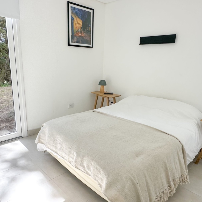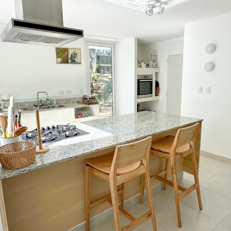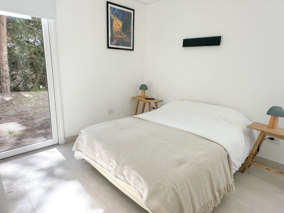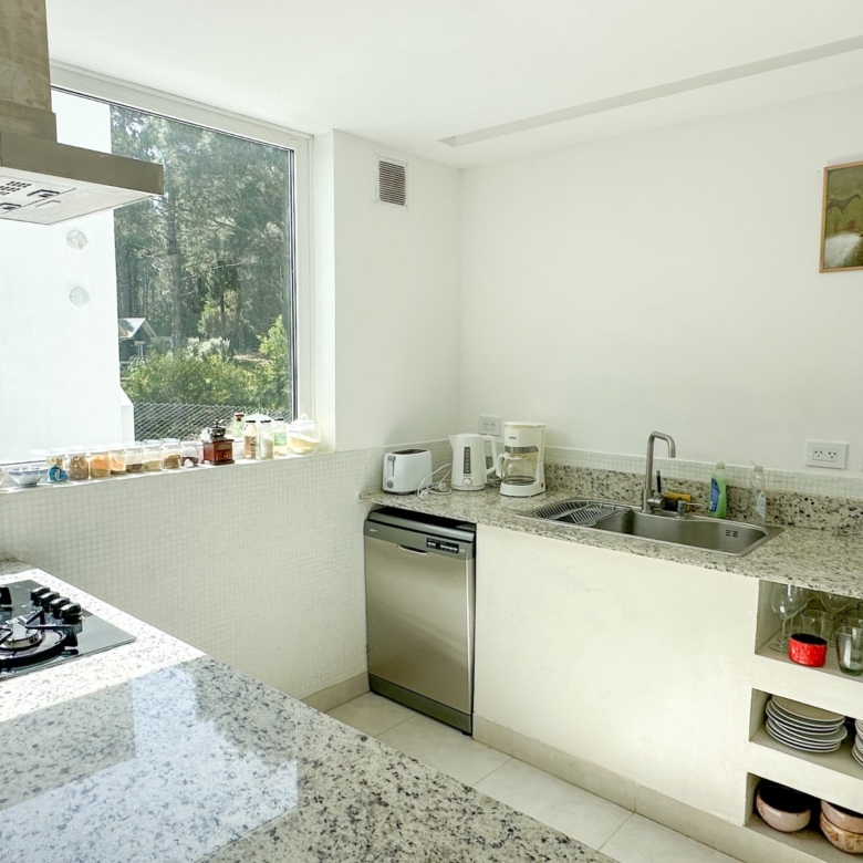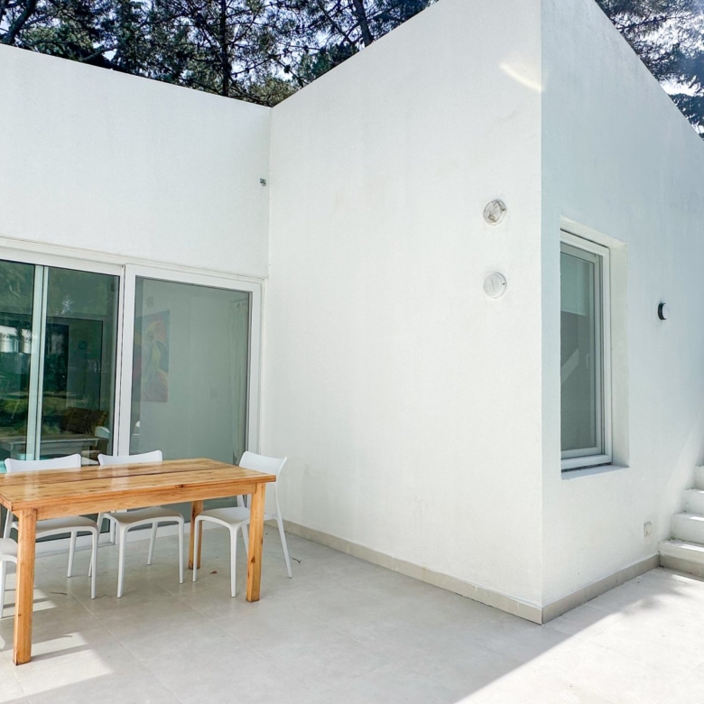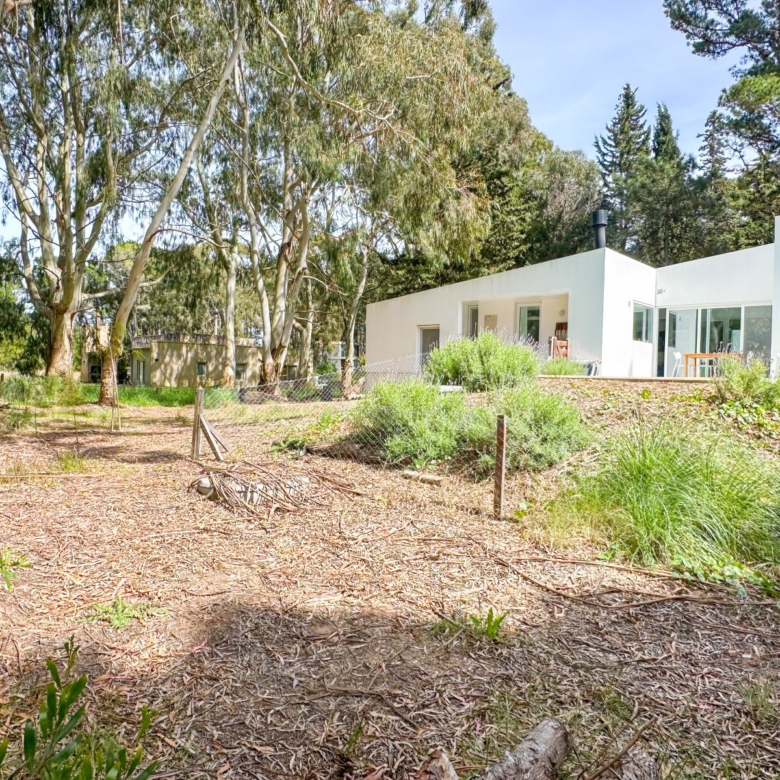 En el hermoso entorno del Barrio Bosque, encontramos esta casa minimalista, sobre un terreno de 1300m2 y rodeada de pinos y vegetacion. La casa cuenta con una amplia y moderna cocina integrada de concepto abierto, con lavadero separado y salida a parrilla exterior, con barra desayunadora, living y estar comedor con salida a a un estar al aire libre con piscina con excelente orientacion y vistas. Cuenta con 4 dormitorios y 2 baños completos, uno de ellos con ante baño. La casa es muy luminosa y sus vistas son abiertas en todas las direcciones, ya que una ventaja de este barrio es que las casas estan muy separadas una de la otra lo cual le da mucha privacidad y sensacion de estar en un bosque. Cuenta con gas natural y calefaccion por estufas que permiten disfrutar la casa todo el año. Cuenta con una terraza con vistas al jardin, piscina y bosque, ideal para disfrutar momentos. Son 135m2 cubiertos y su distribucion logra mucha comodidad para sus ocupantes. Otra gran ventaja del barrio es que son pocos lotes y estan todos construidos con lo cual no hay ni habra obras en curso. Tambien el transito de vehiculos incluso en temporada alta es casi nulo. El acceso de la ruta es excelente lo cual es genial para Costa Esmeralda que es tan grande, termina siendo muy practico. Cuenta con una proveeduria muy cerca a la cual se puede llegar caminando. El acceso a la playa es a 10 minutos por vias principales de muy facil llegada. Se vende por viaje al exterior y se escuchan propuestas serias