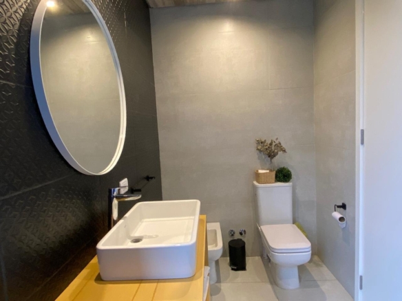 Su distribución se desarrolla en dos plantas. Al ingresar por la planta alta nos recibe un hall de entrada, un amplio living comedor con cocina integrada. Además toilette de recepción.