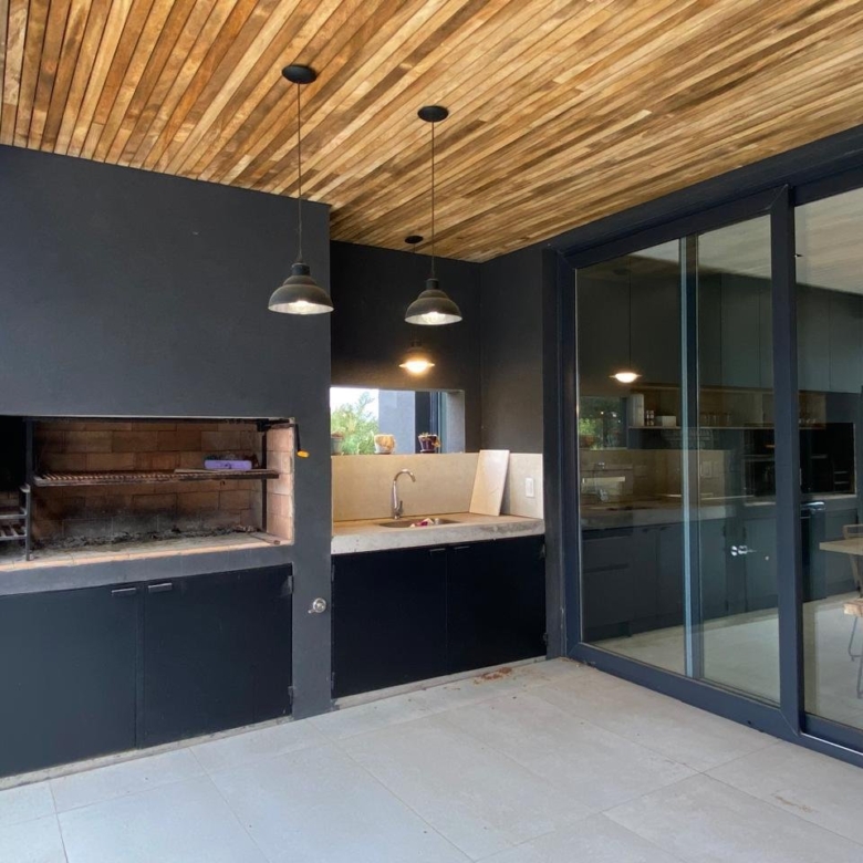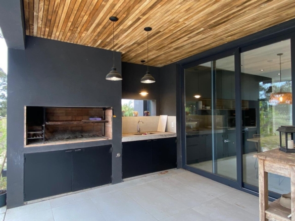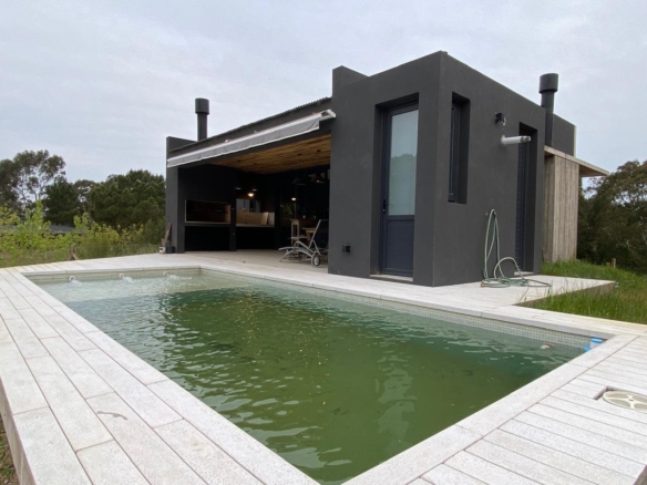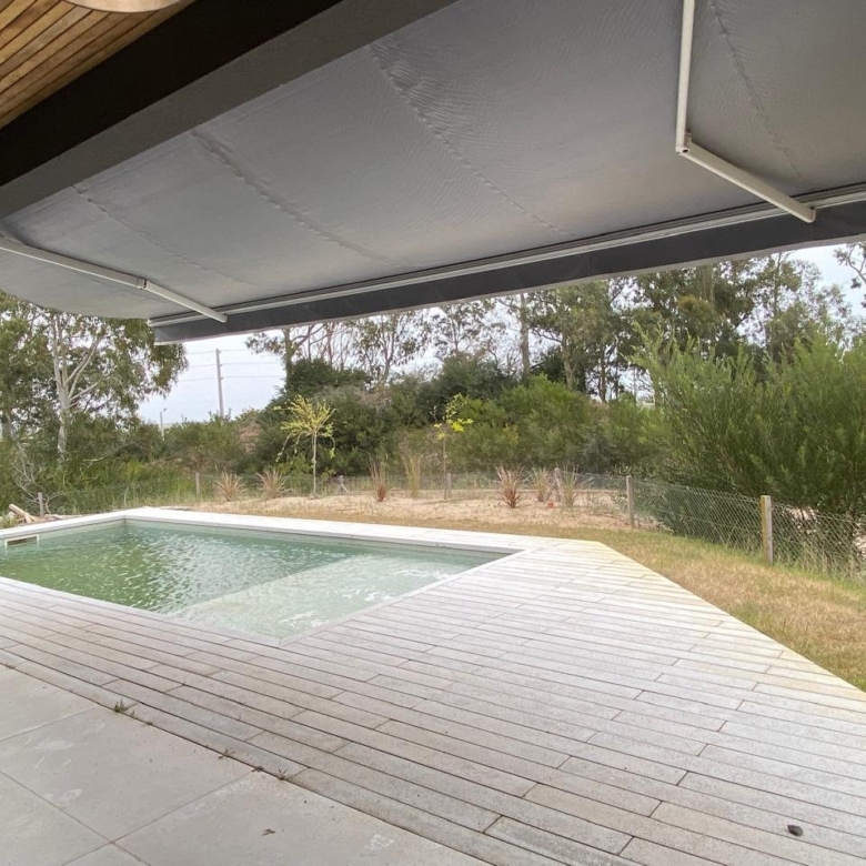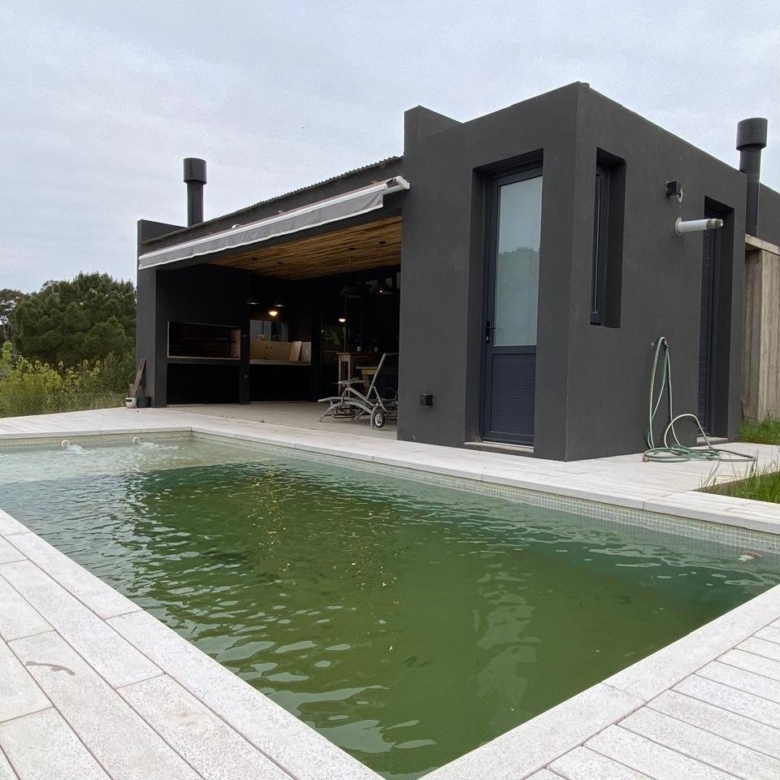 Desde el living salimos a una galería semicubierta con parrilla y a continuación solarium y pileta, la cual por la orientación del lote tiene sol todo el día y se pueden apreciar atardeceres increíbles. También tiene toilette para uso de la pileta.