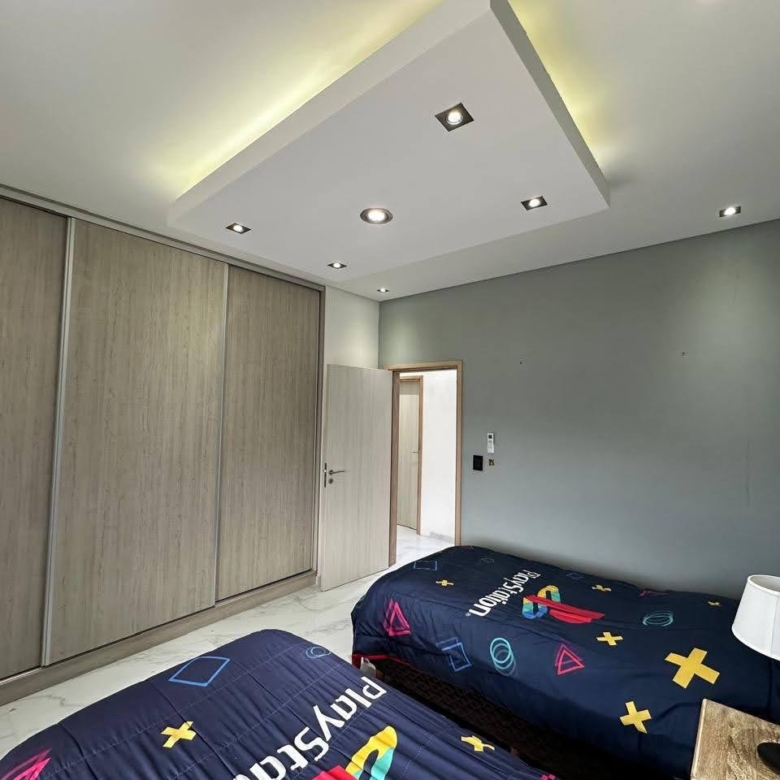 Área privada con una amplia habitación con camas dobles, un playroom y una habitación principal, todas servidas por un antebaño y baño compartido. Estas habitaciones tienen, además, acceso directo al exterior mediante un balcón privado.