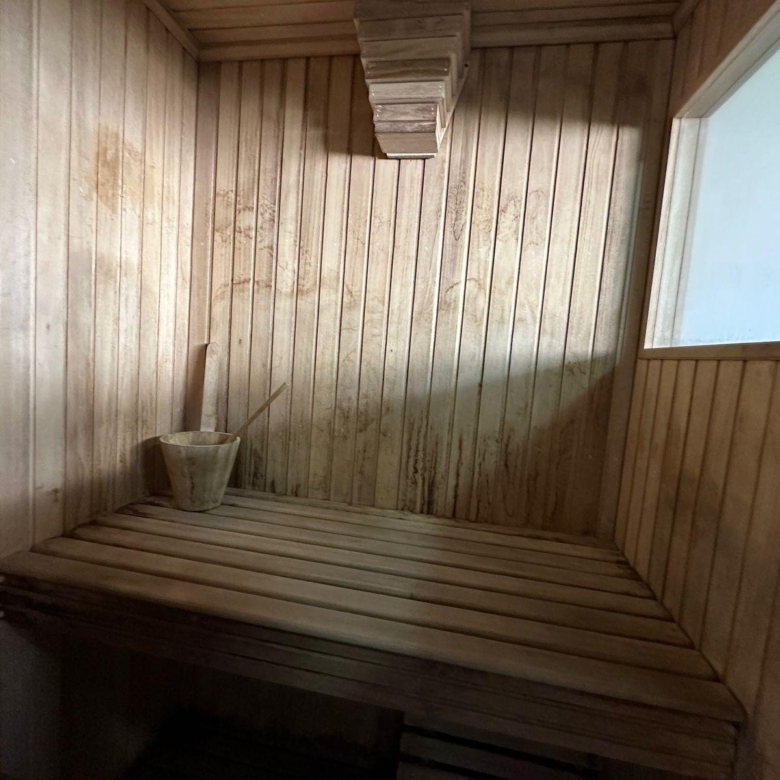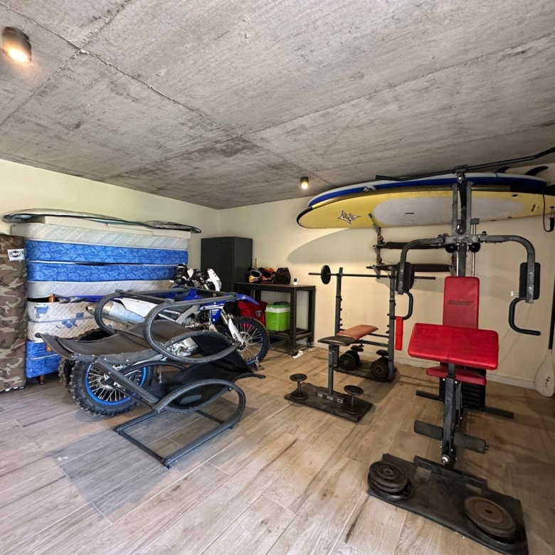En el frente de la casa está el acceso a cochera cubierta para dos vehiculos, baulera amplia gym, y habitacion con sauna y baño completo.