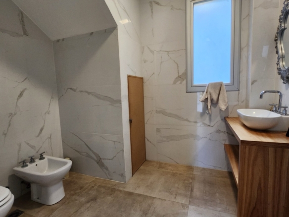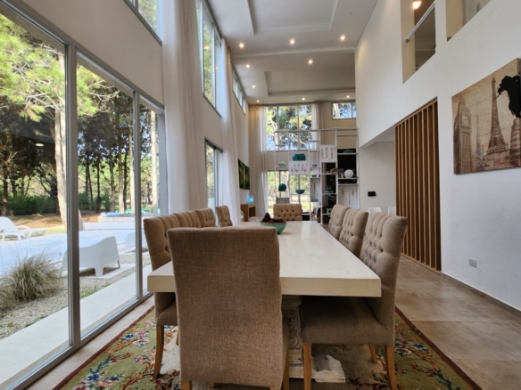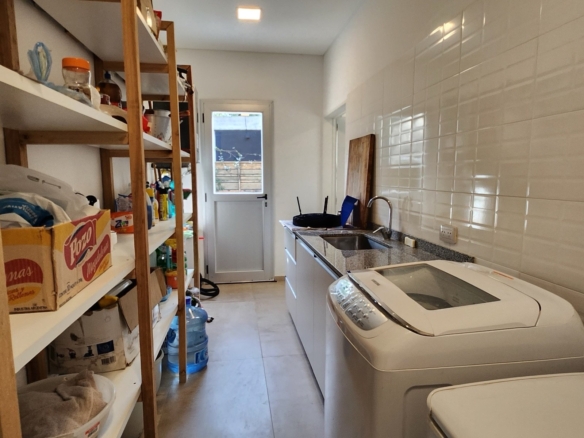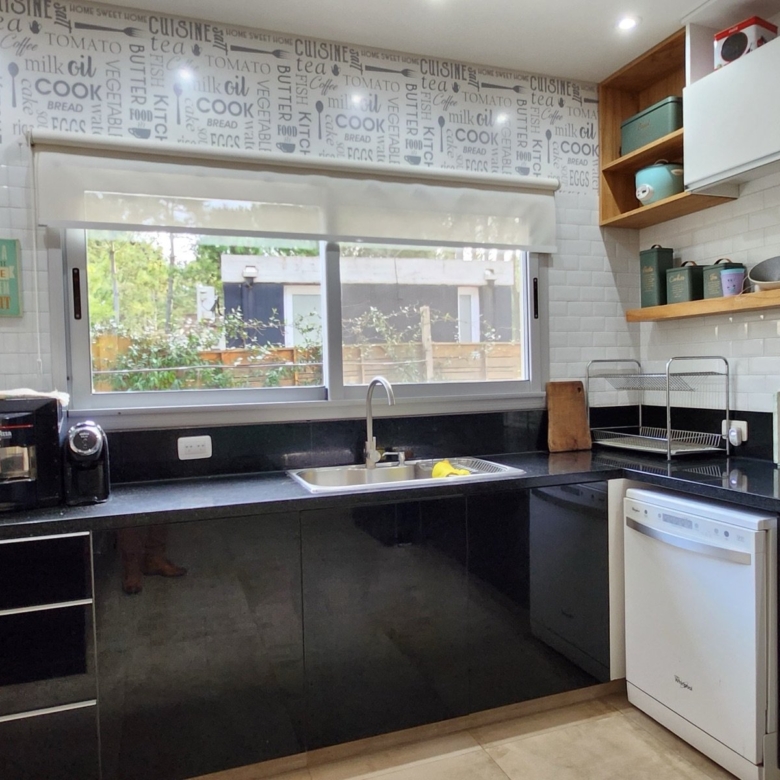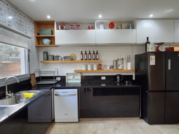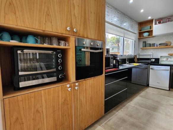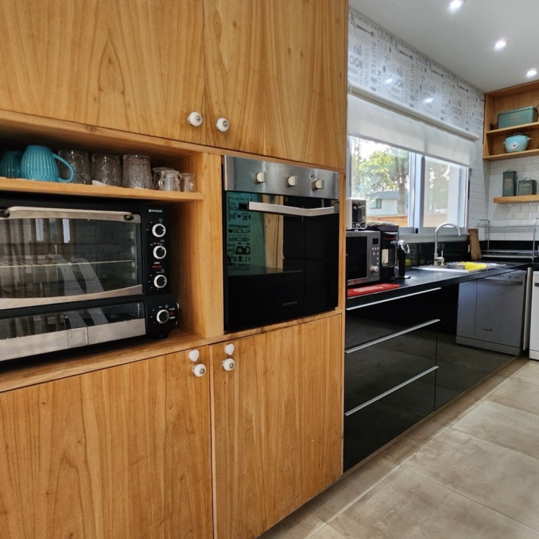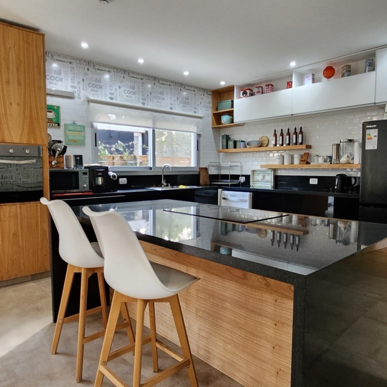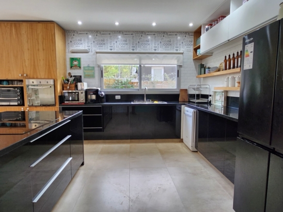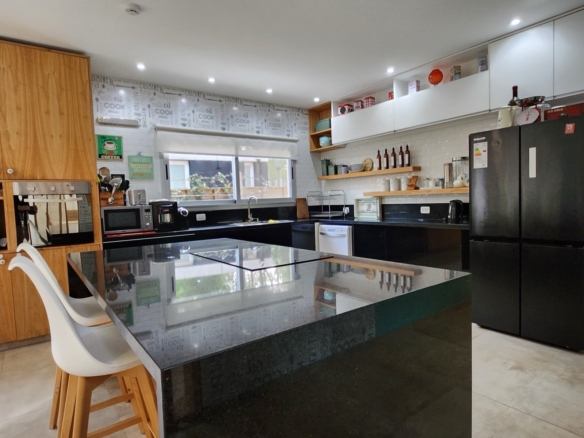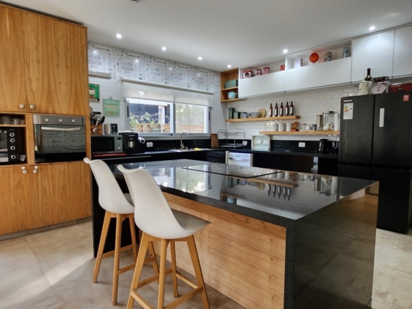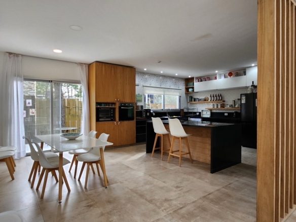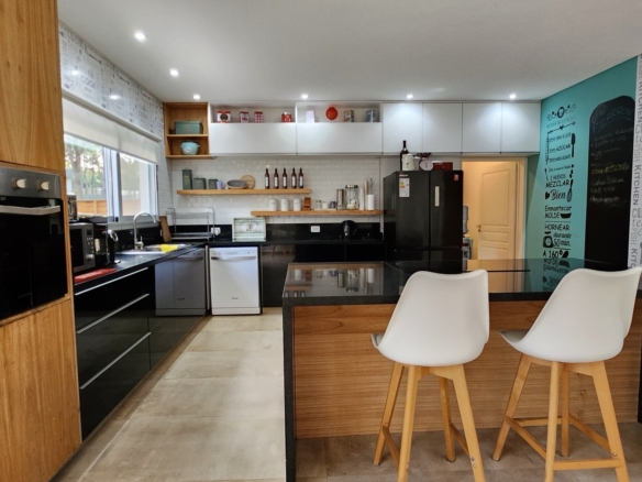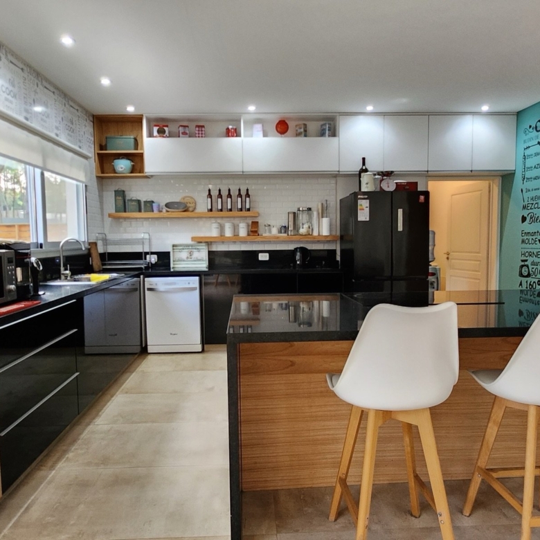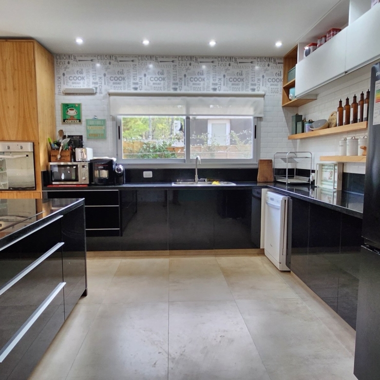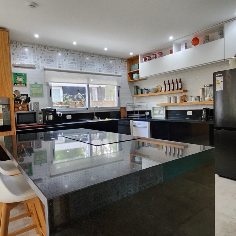 La casa cuenta con 5 dormitorios, uno de ellos en suite, y un total de 4 baños completos. Su living comedor se destaca por su luminosidad y conexión con el parque. La cocina, amplia y funcional, está integrada a un lavadero independiente.