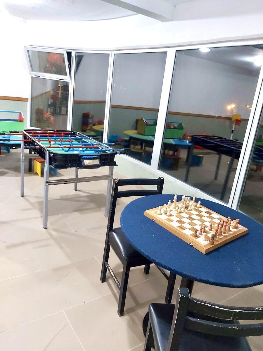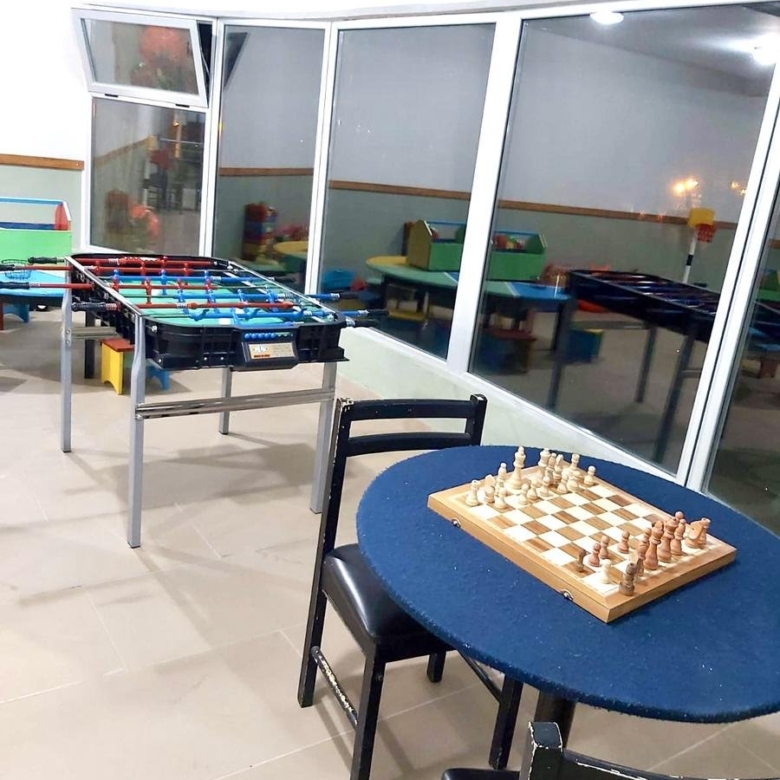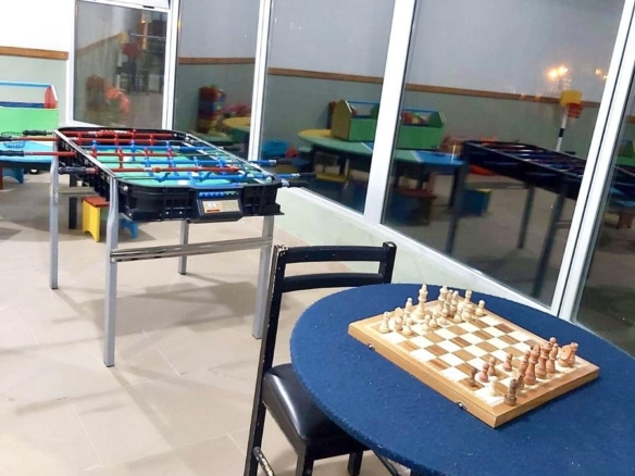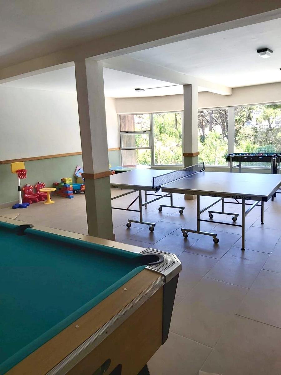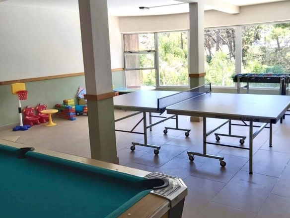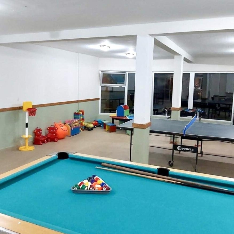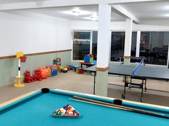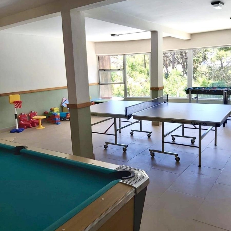 Sala de juegos con mesa de pool y ping pong