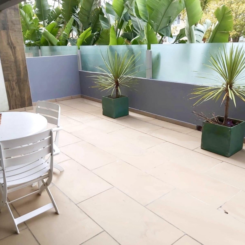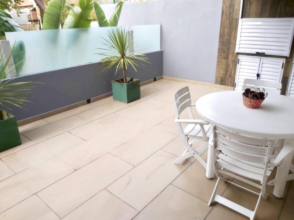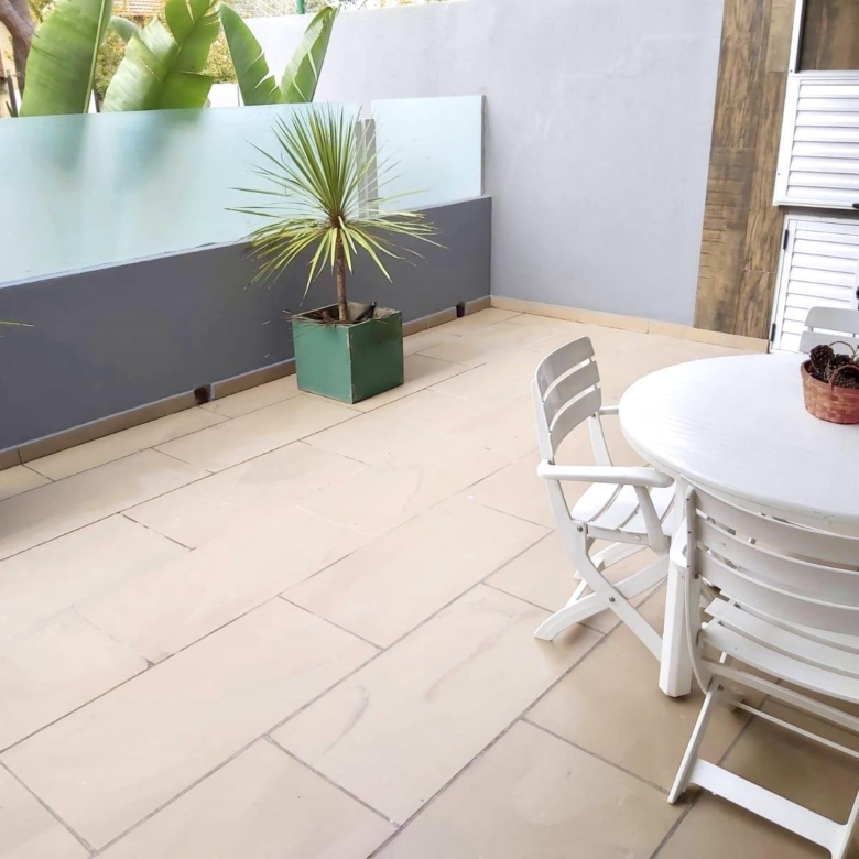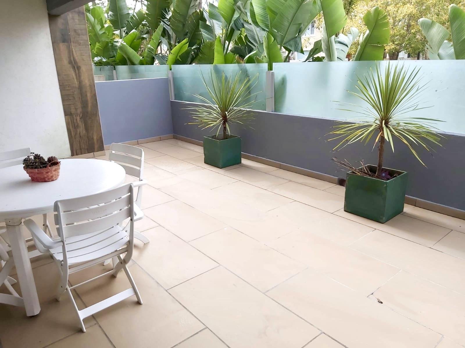 Amplia terraza con parrilla, juego de mesa y sillas de exterior