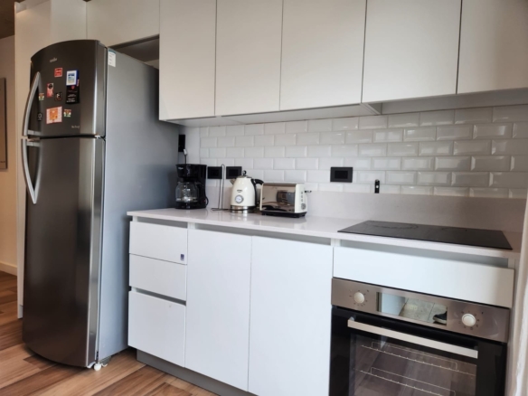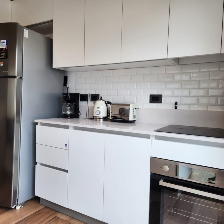 Cocina con mesadas de Silestone, muebles bajo mesada y alacenas en melamina blanca