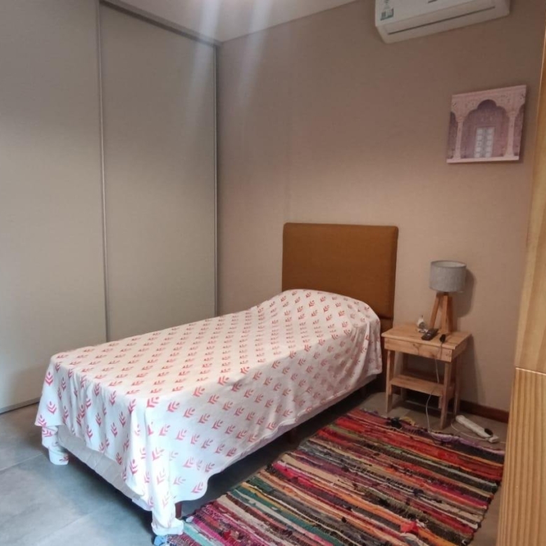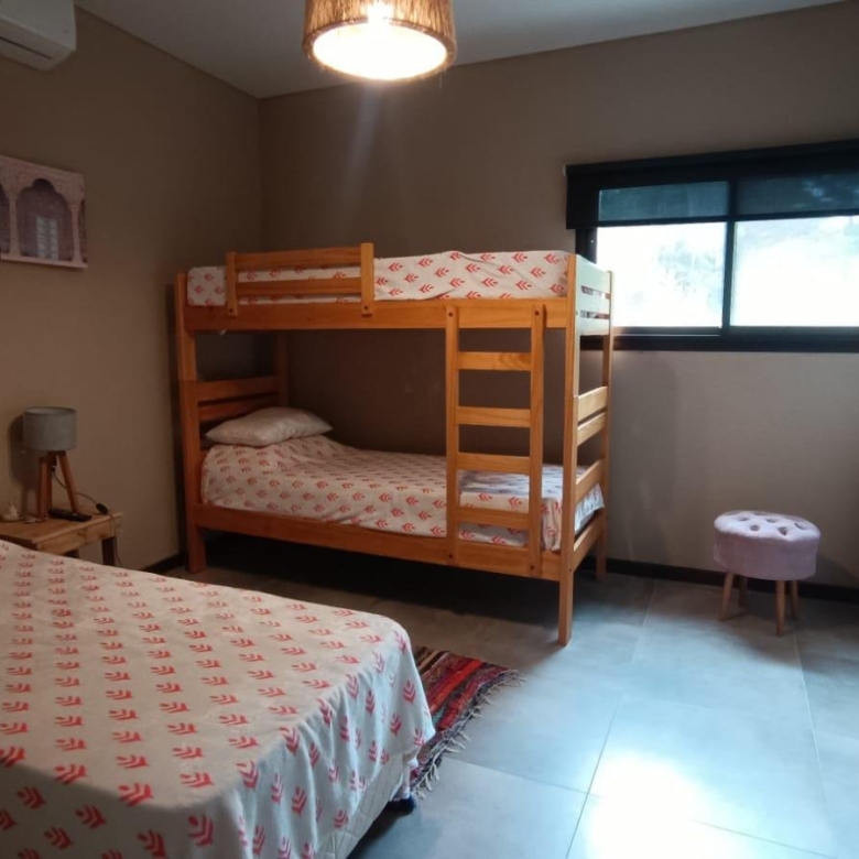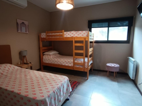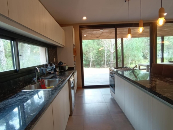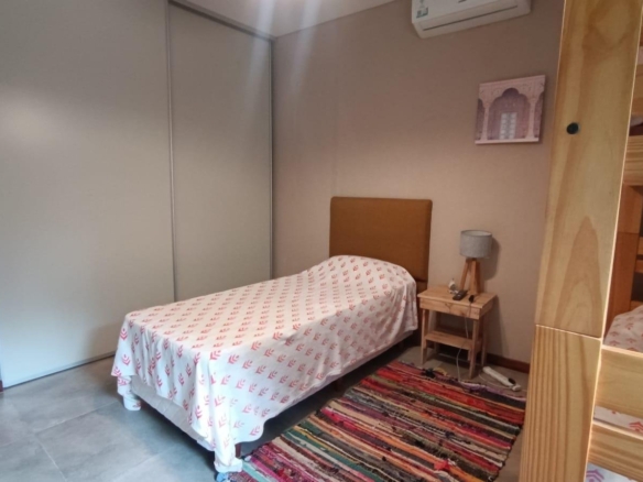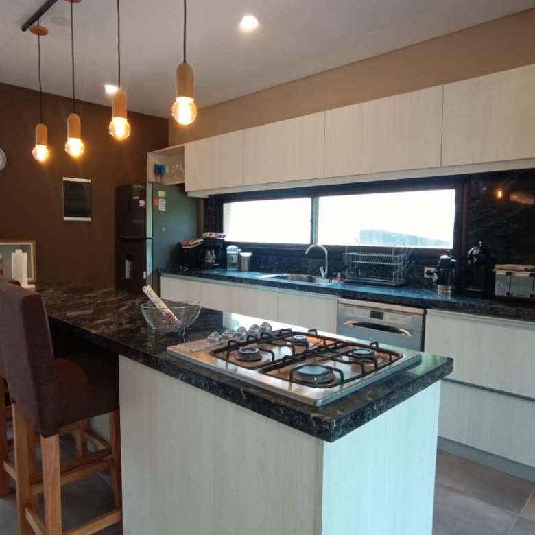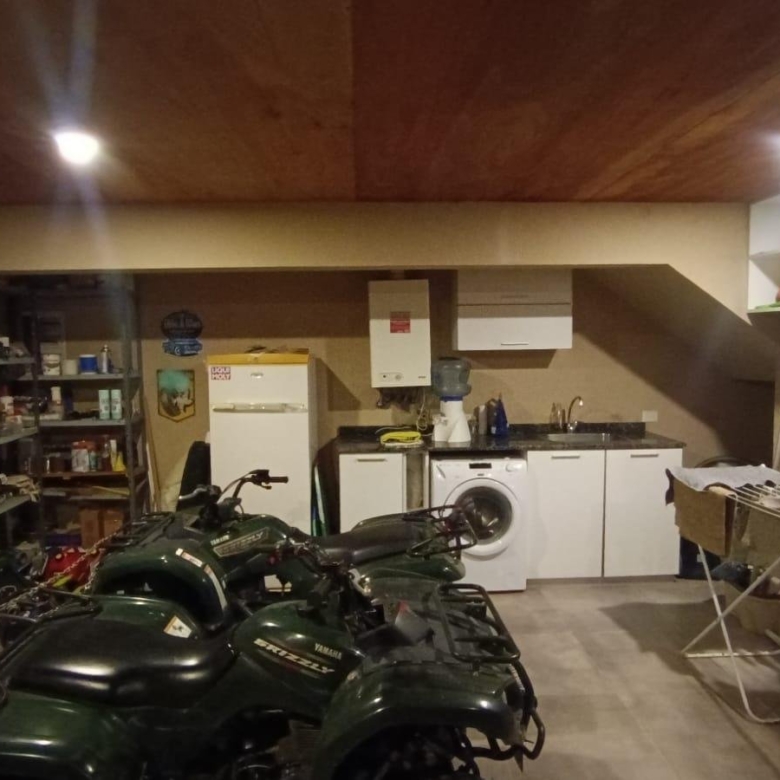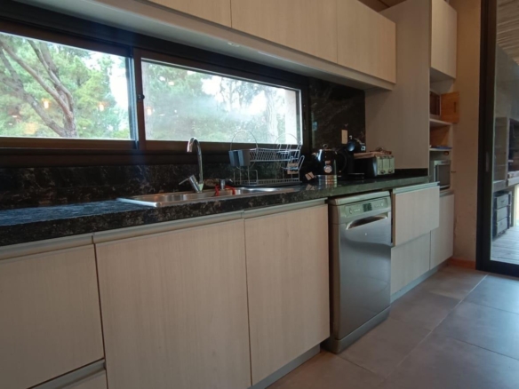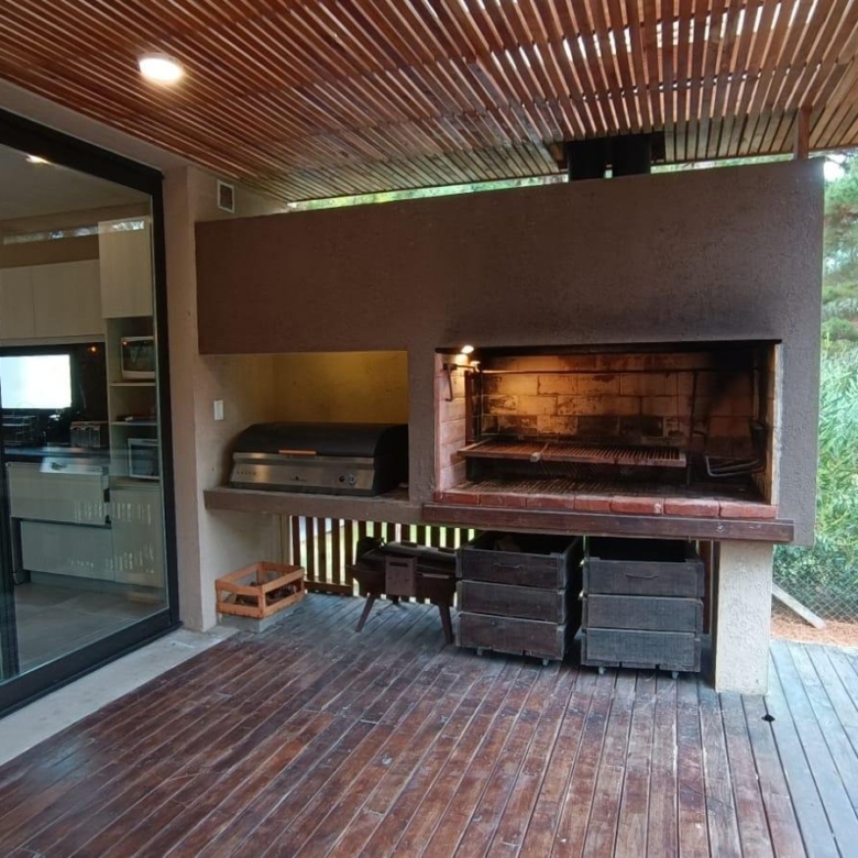 En planta baja dos dormitorios, baño completo, galería interna, living – comedor, cocina integrada con isla, amplia galería con parrilla tradicional y parrilla a gas Tromen, patio arbolado.