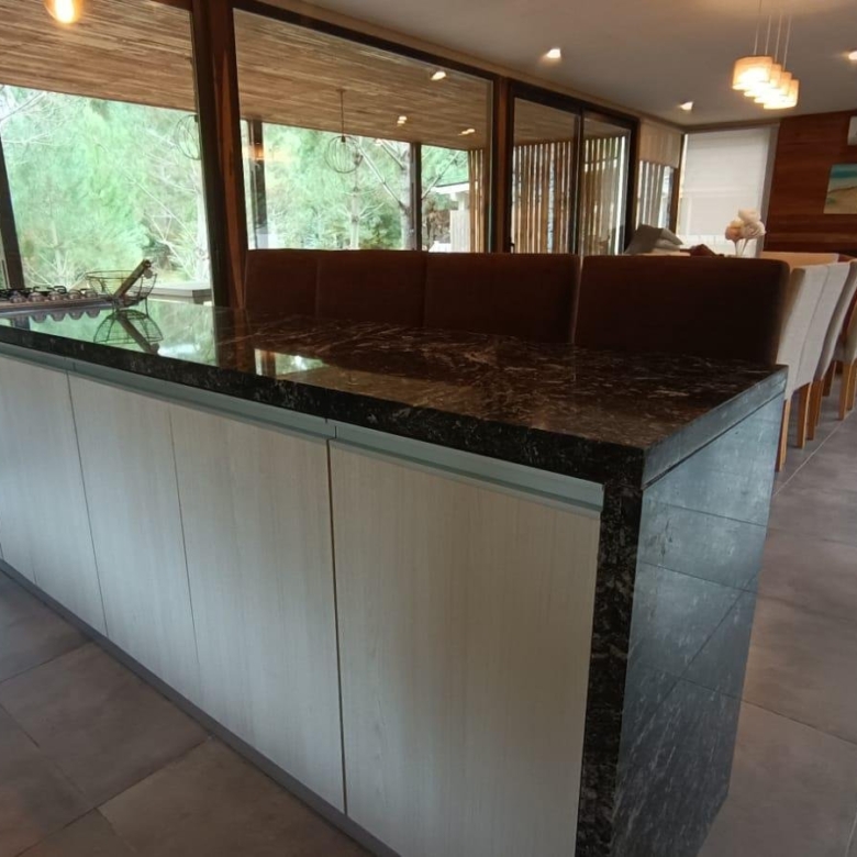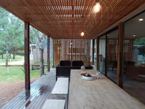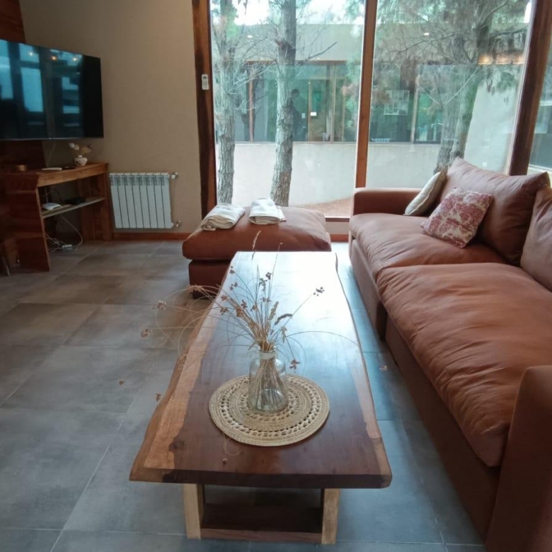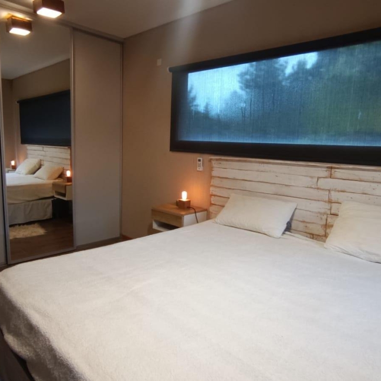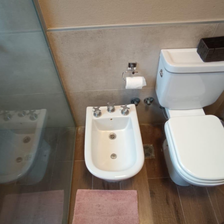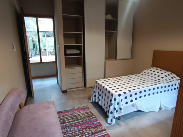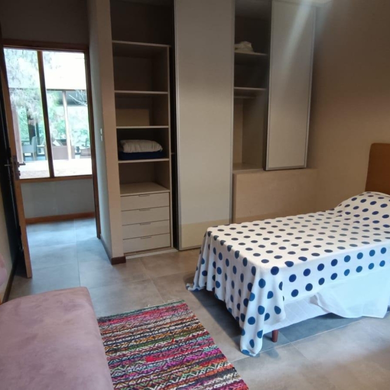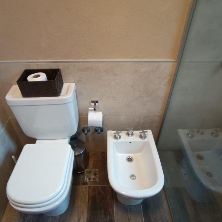 En planta baja dos dormitorios, baño completo, galería interna, living – comedor, cocina integrada con isla, amplia galería con parrilla tradicional y parrilla a gas Tromen, patio arbolado.