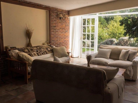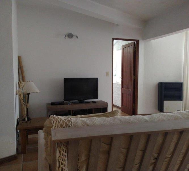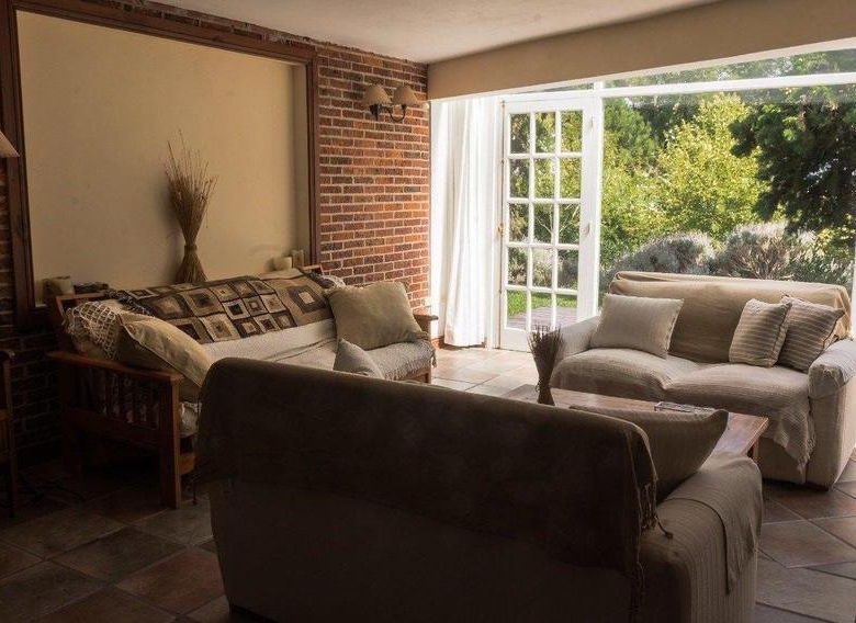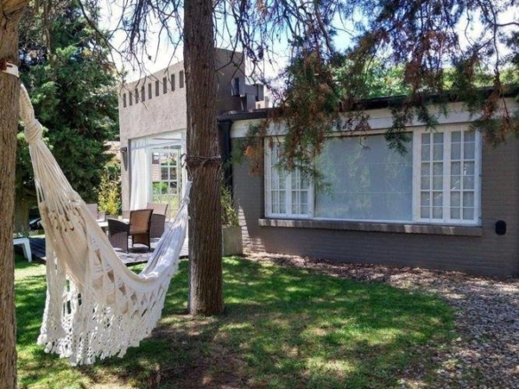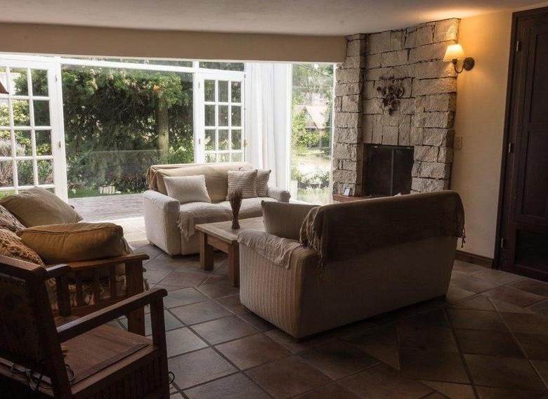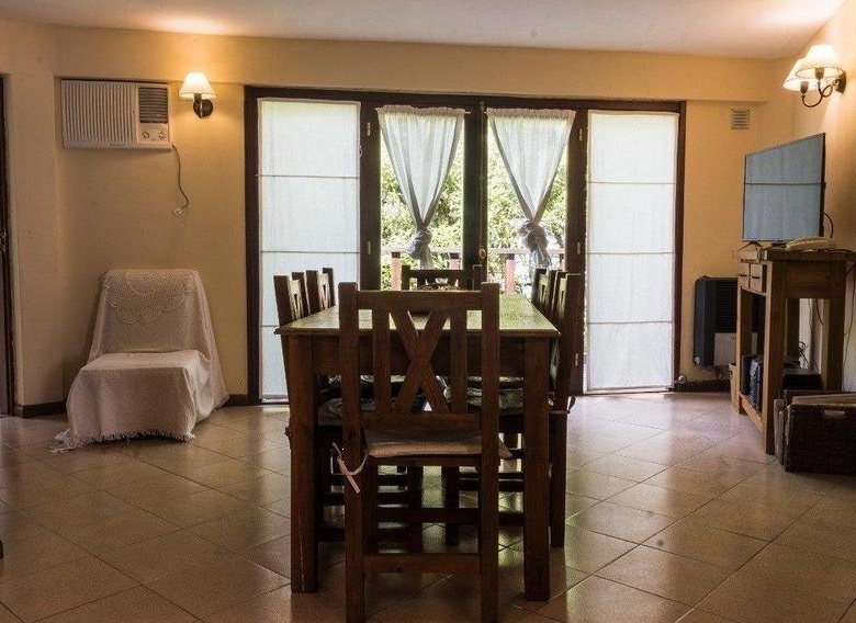 Hall de entrada, living con hogar a leña y un ventanal que da al jardín con deck, comedor con cocina integrados por barra
